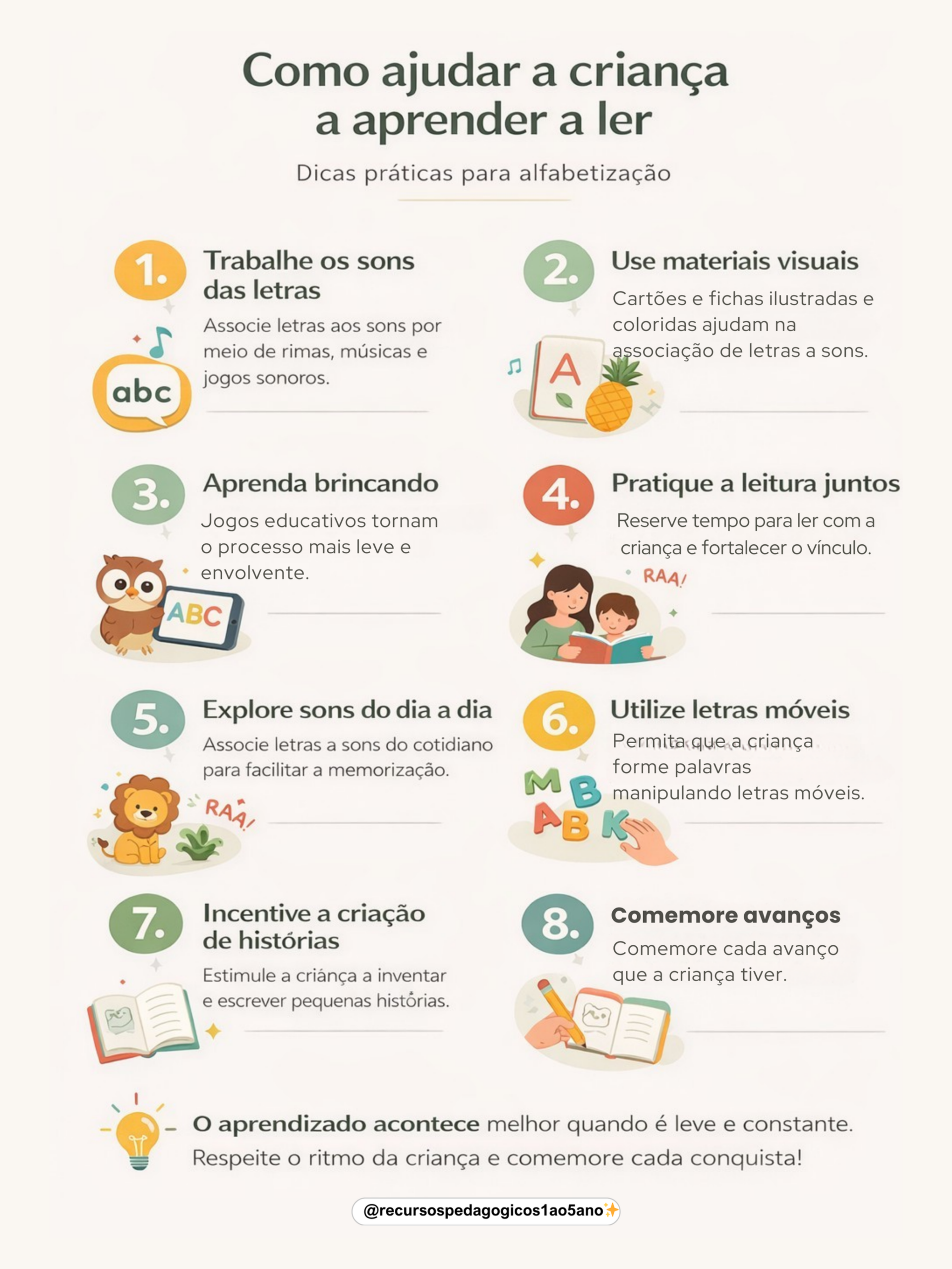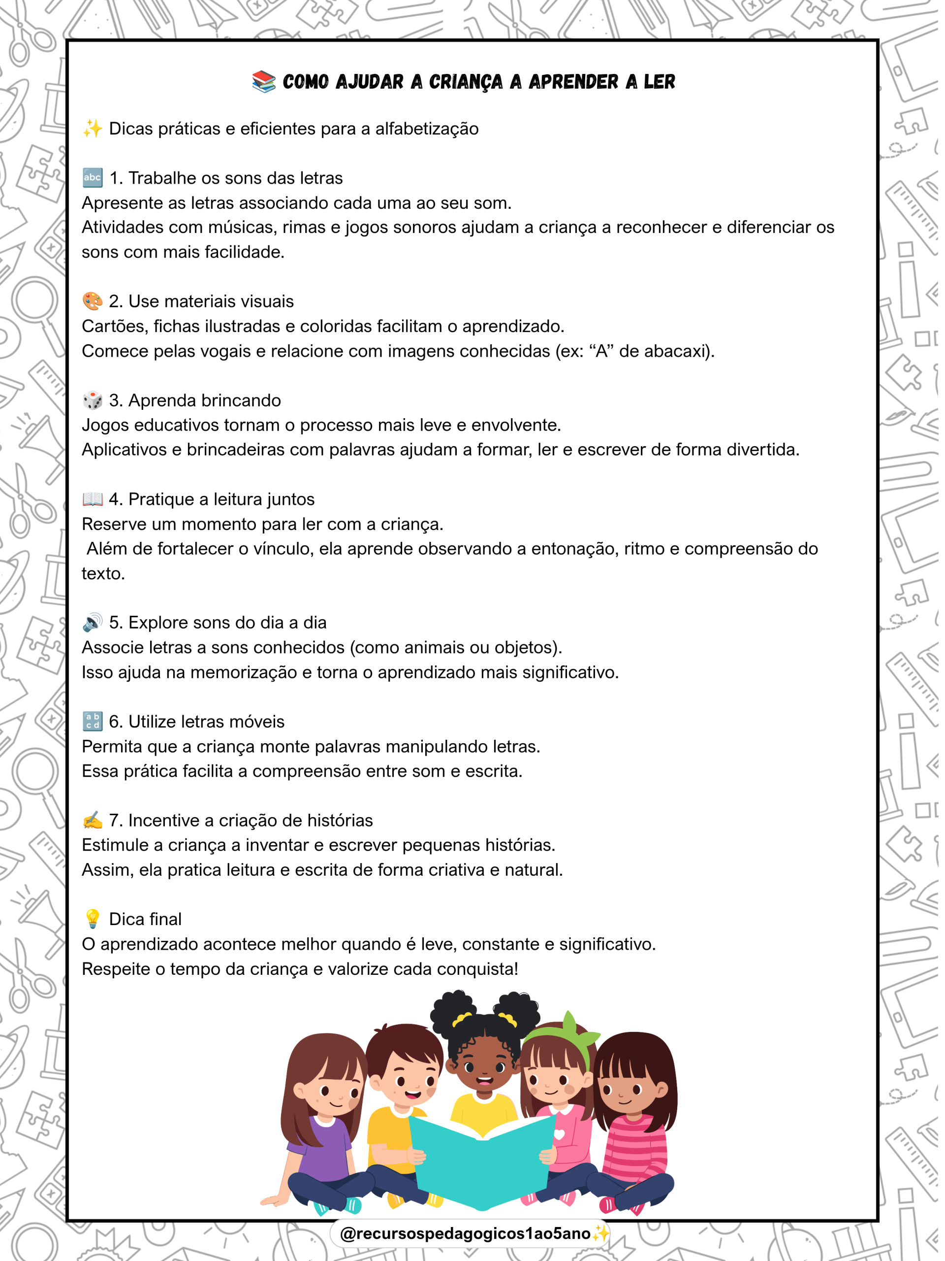 Preparei um material com dicas práticas e essenciais para o processo de alfabetização, ideal para aplicar no dia a dia em sala de aula ou em casa.