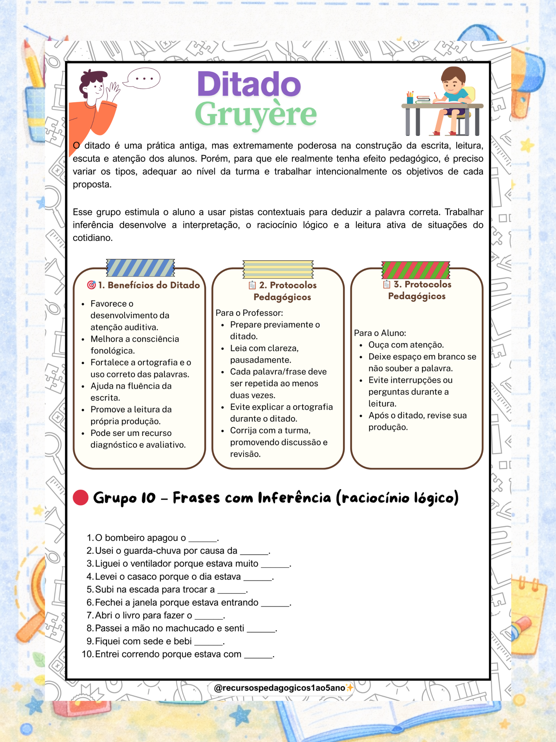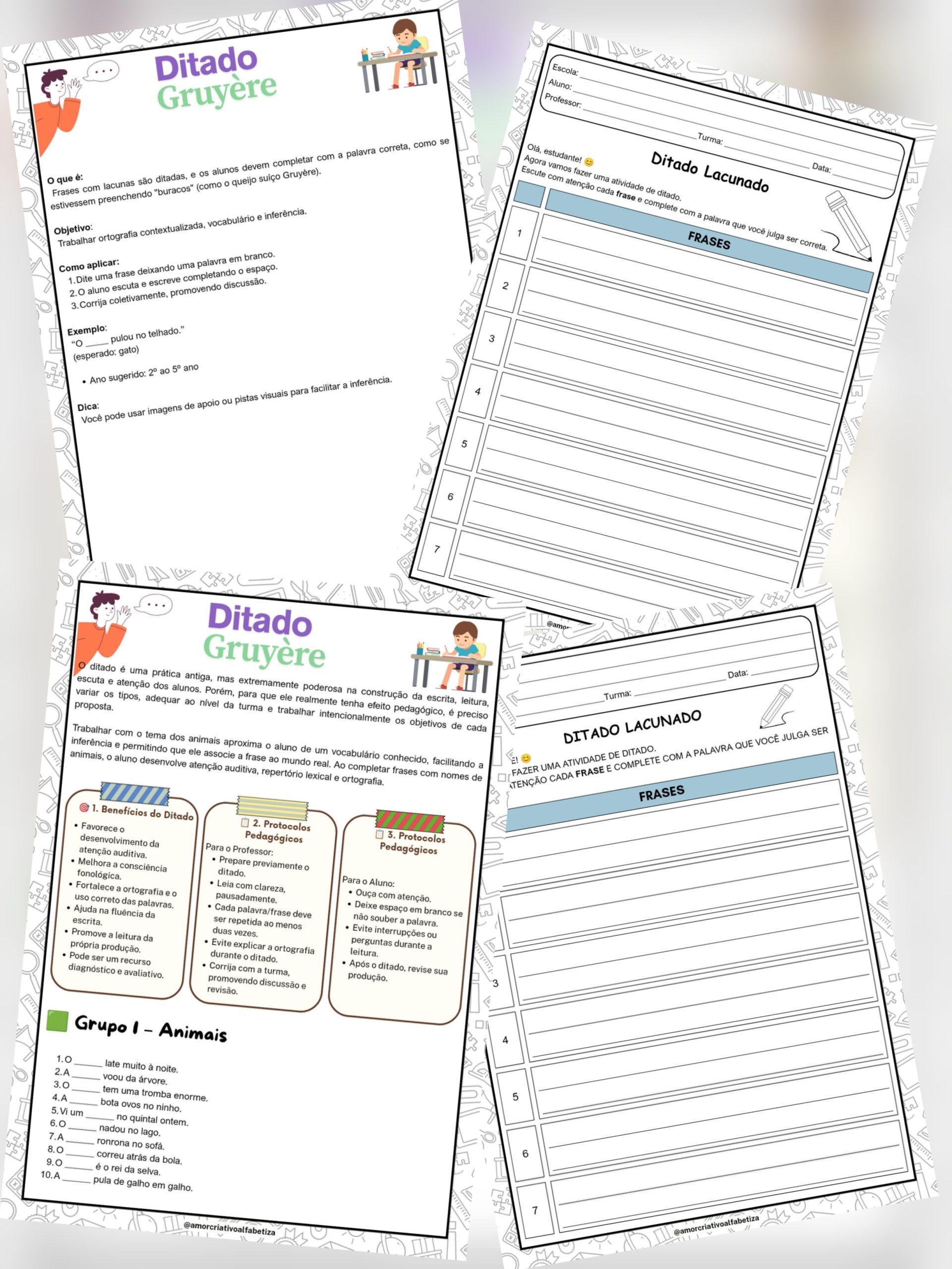 O Ditado Gruyère (Ditado Lacunado) é uma proposta pedagógica completa que vai além da escrita mecânica. Com ele, o aluno escuta, interpreta e pensa antes de registrar, desenvolvendo habilidades essenciais para a alfabetização e consolidação da escrita.