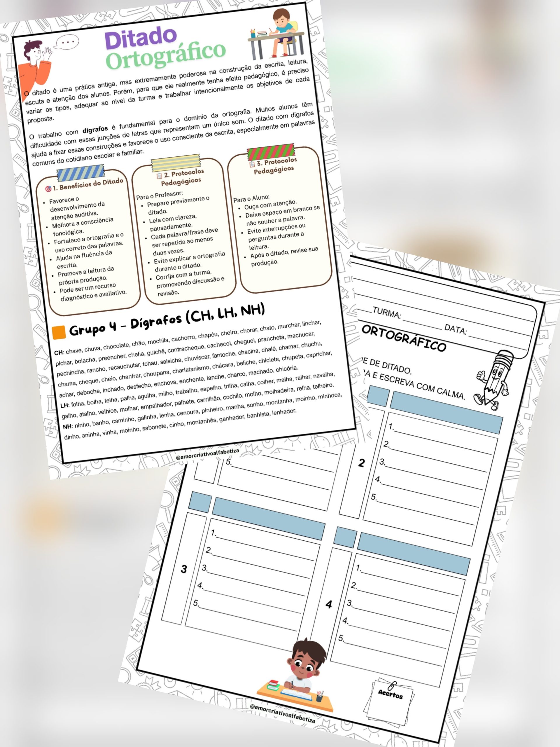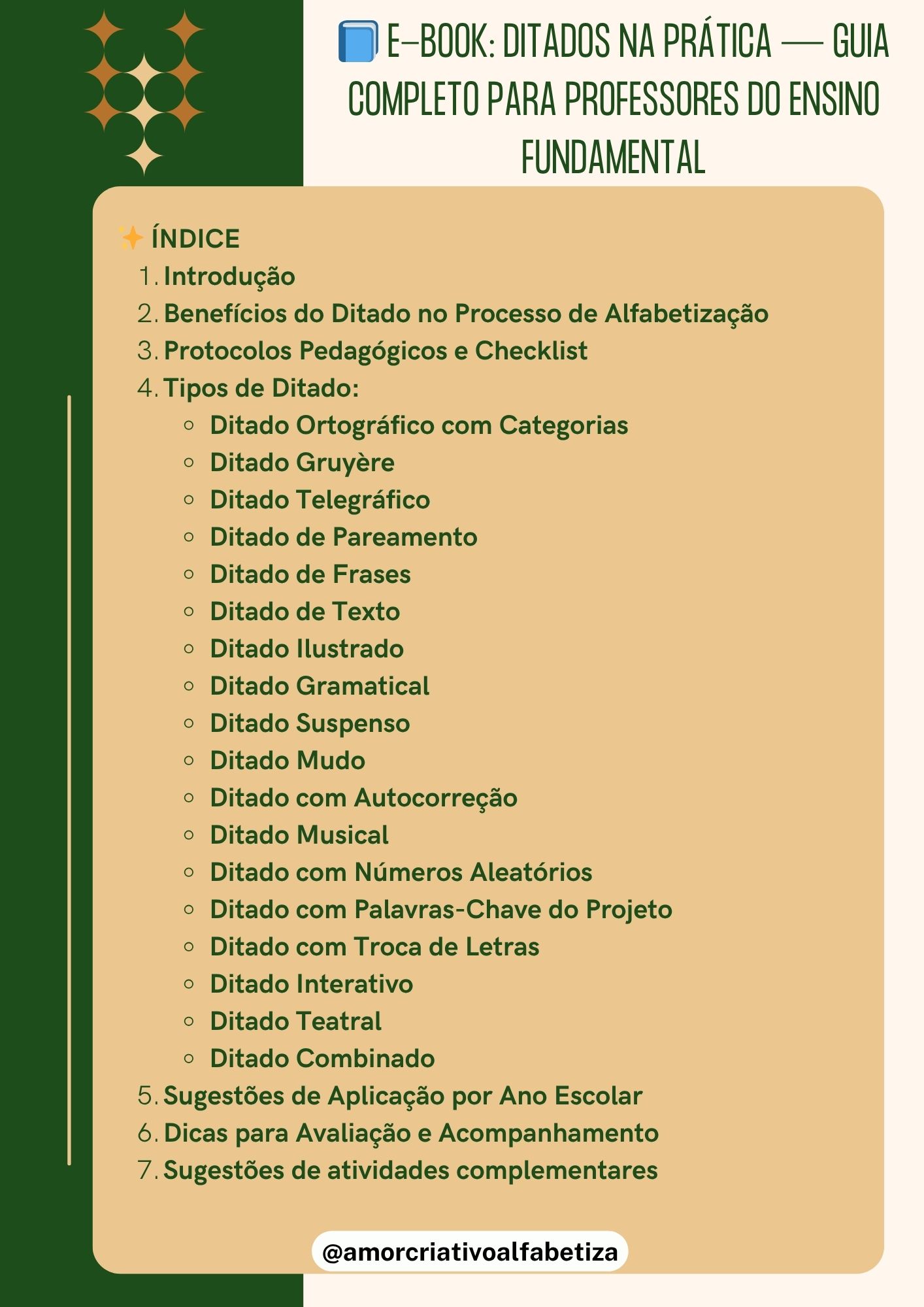 🎁 Bônus especial: você ainda recebe o e-book Ditados na Prática, com orientações pedagógicas para aplicar o ditado de forma intencional durante todo o ano letivo. 💡📚